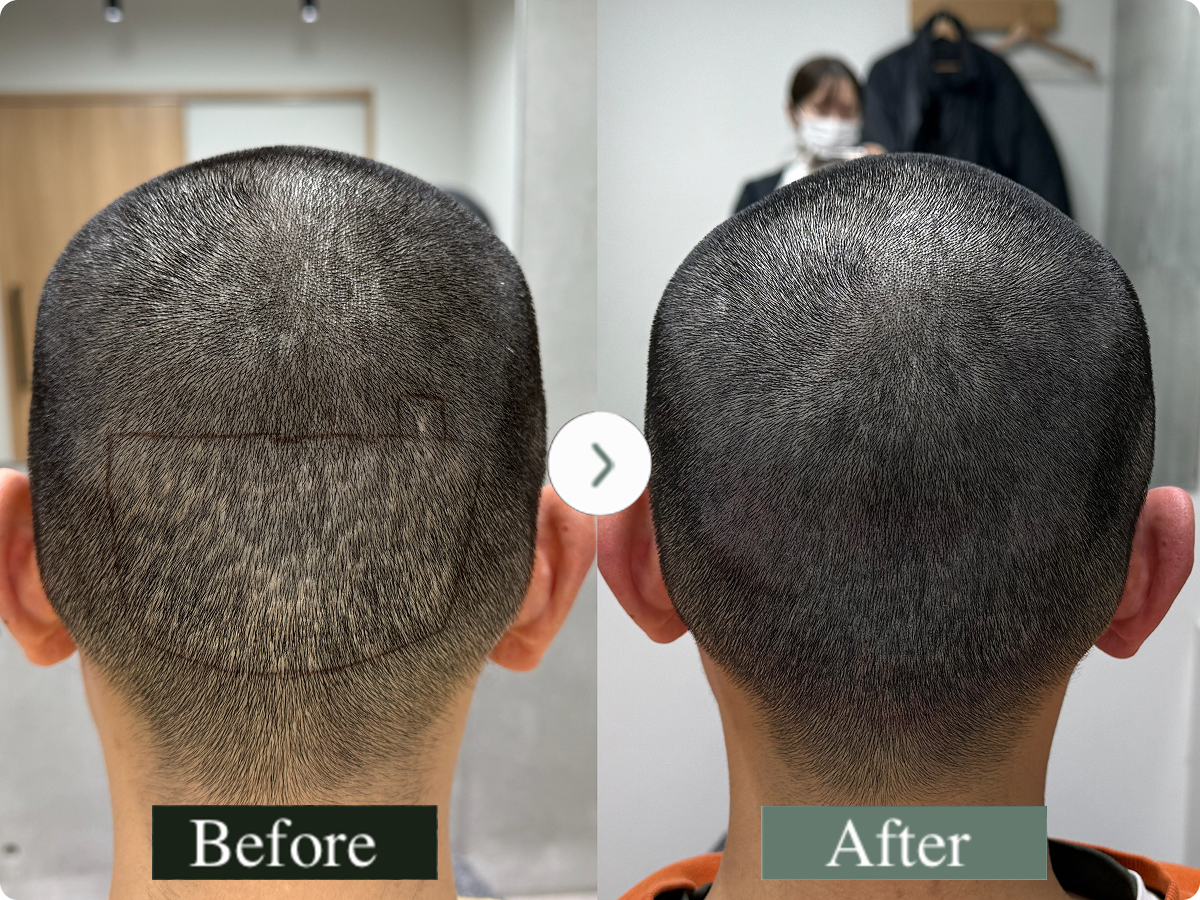 後頭部はもともと髪が太くしっかりしている部位のため、髪質に合わせて太めの針と濃いめの色素を使用し、傷跡部分の目立ちをしっかりとカバーしました。