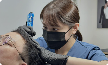 施術部位にマーキングを行い、濃さ・範囲・密度などのデザインを丁寧に確認。一度皮膚の中に入れた色素を除去する場合「レーザー除去」が必要となるため、施術範囲やデザインを慎重に決めていきます。